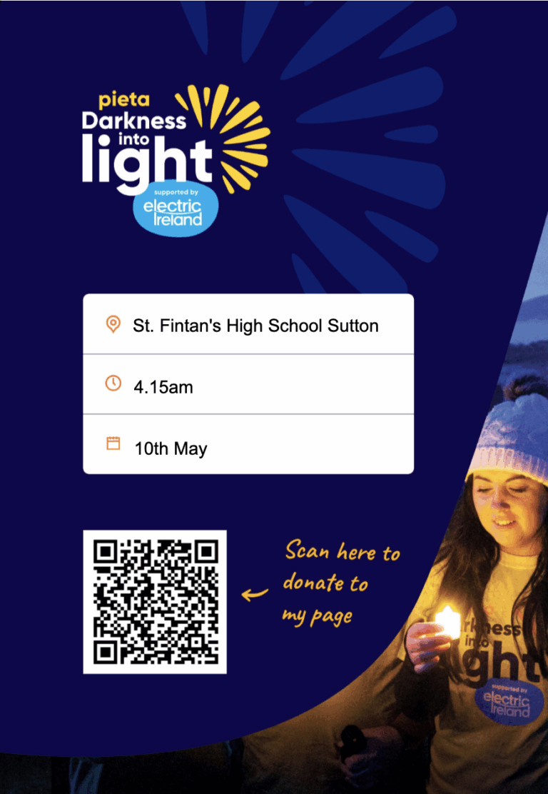 Our Annual Darkness Into Light Walk will take place on the 10th of May this year starting at 4:15am from the school premises to Howth Harbour. This walk is an important occasion to highlight and support mental health in Ireland and forms part of the Nationwide initiative in placing importance on our mental health and looking after it.