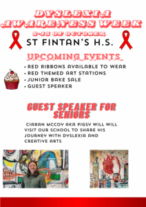Today, Wednesday the 8th of October is World Dyslexia Day and marks the start of our Dyslexia Awareness Week at St. Fintan’s High School. We started today with handing out red ribbons for Dyslexia Awareness to all students upon arriving at school and in key areas of the school we have installed Red Ribbon Displays giving information about dyslexia and profiling famous faces who have dyslexia.