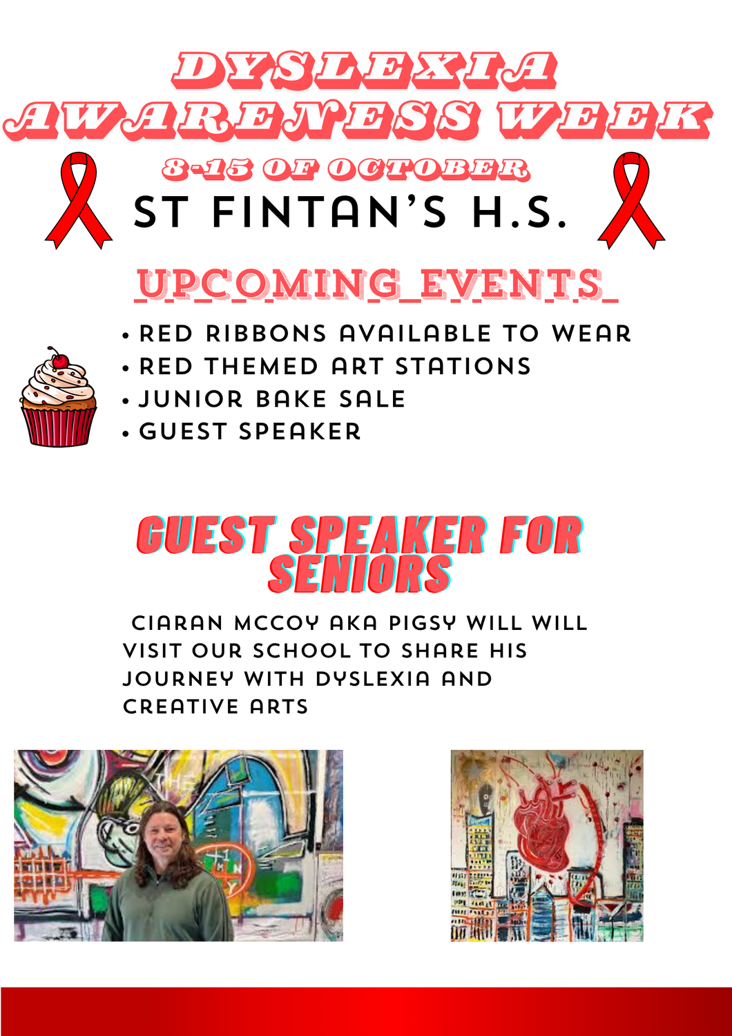 We have a range of events planned over the coming week including quizzes, red workshops and a Bake Sale next Wednesday to raise funds for the Aen Department and a talk by the artist Ciaran McCoy for senior students to discuss his experiences with having dyslexia. Our Bake Sale last year enabled us to buy new E-Readers for the AEN Department and we hope to be able to add to these resources in the coming year.